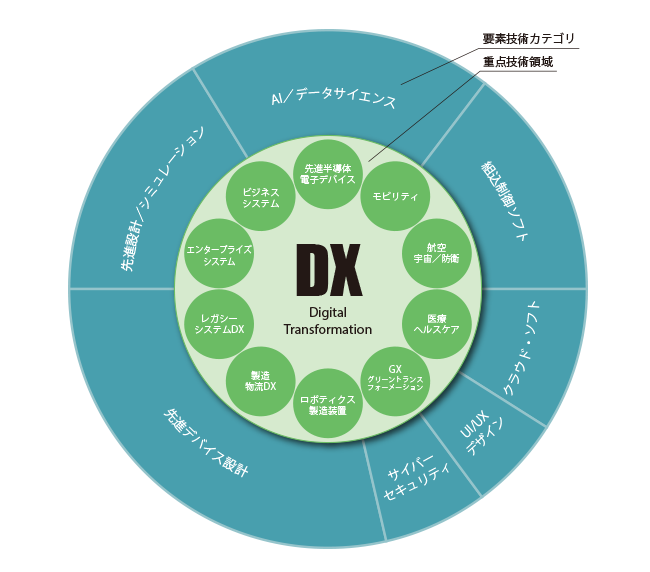 テクノプログループ全体で策定した『テクノプロ技術戦略マップ2030』では、将来の市場性・技術革新の流れを見据え、7つの要素技術カテゴリを横軸に、10の重点技術領域を縦軸とし、縦軸・横軸ともに重要度が重なった部分に注力する戦略をとっております。