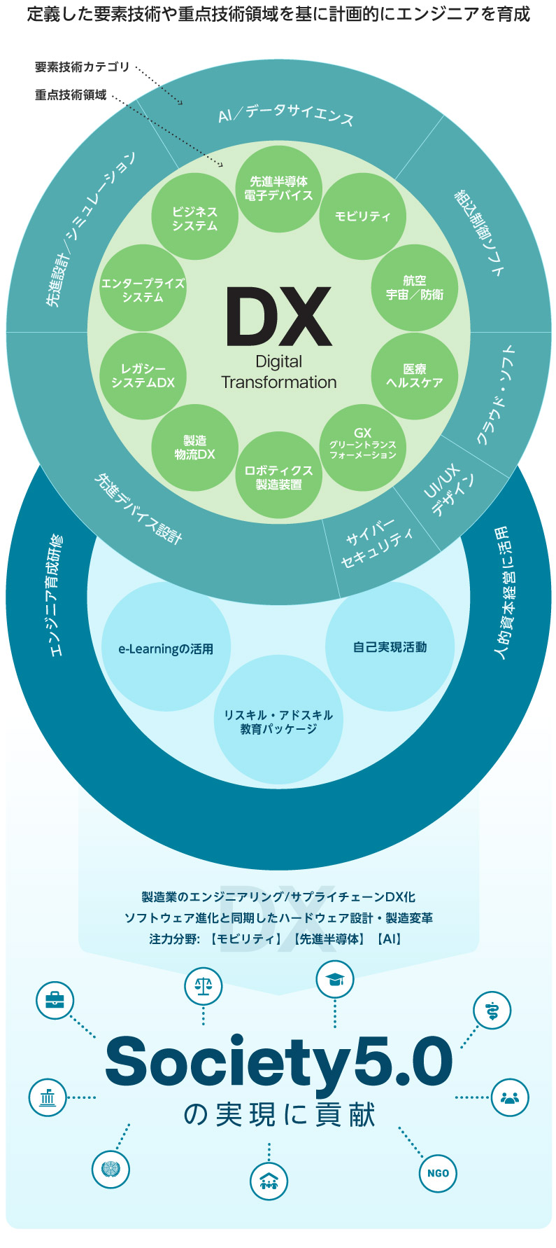 当社では「『技術』と『人』のチカラでお客さまと価値を共創し、持続可能な社会の実現に貢献する。」を存在意義(パーパス)として掲げており、Society5.0実現に貢献するため、新たに【テクノプロ 技術戦略マップ2030】を策定しました。これは、今後の当社エンジニアの採用・育成や注力分野への投資を通じて先端技術の提供が可能なエンジニアリング能力を強化、お客様へ新しい付加価値をご提供することを目的としています。
