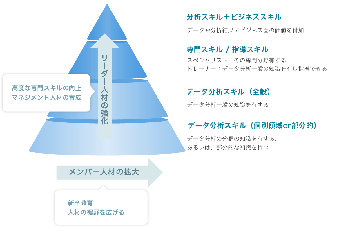 若手層向けには、基本的なデータ分析スキルを身に着ける講義・演習や、実案件に入りながら実際に一通りの分析プロセスを体験するOJT型など、多種多様な教育サービスを提供しています。