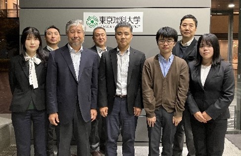 関係者集合写真 (前列左から:当社 地川、東京理科大学 松尾教授、立川教授、青木助教、当社 地引 、後列左から:当社 小久保、伯田、高瀬)