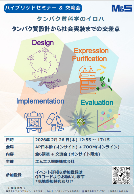 今回、エムエス機器様主催のハイブリッドセミナー「タンパク質科学のイロハ」にて、当社の寒川が「ローコスト/ハイスループットな膜タンパク質発現系」について講演します。